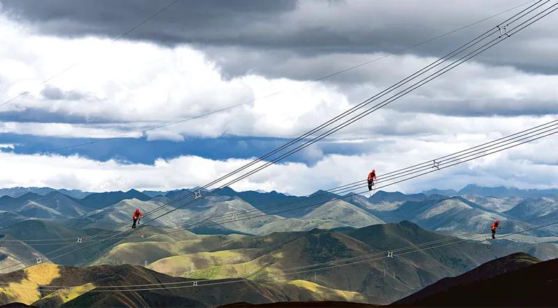 近年來,中央企業把加強黨的領導和完善公司治理統一起來,在維護國家戰略安全、保障和改善民生等方面更加擔當作為。圖為2021年6月11日,國家電網四川送變電公司黨員先鋒隊員對四川省甘孜州兩河口水電站500千伏送出工程線路進行消缺驗收。 國務院國資委供圖 劉湘釩/攝